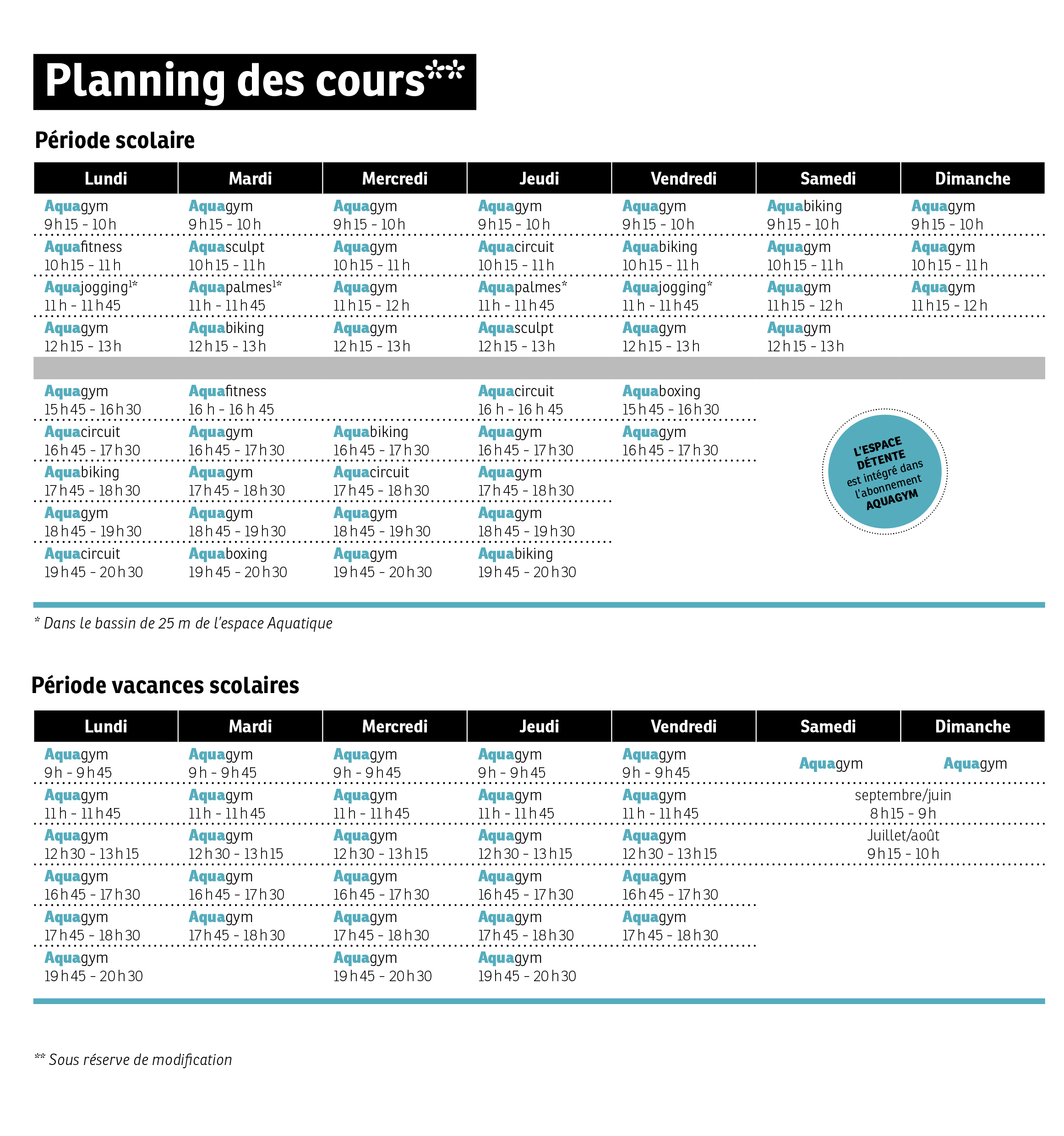 Aquagym 9h15-10h | Aquagym 9h15-10h | Aquagym 9h15-10h | Aquagym 9h15-10h | Aquagym 9h15-10h | Aquabiking 9h15-10h | Aquagym 9h15-10h |
