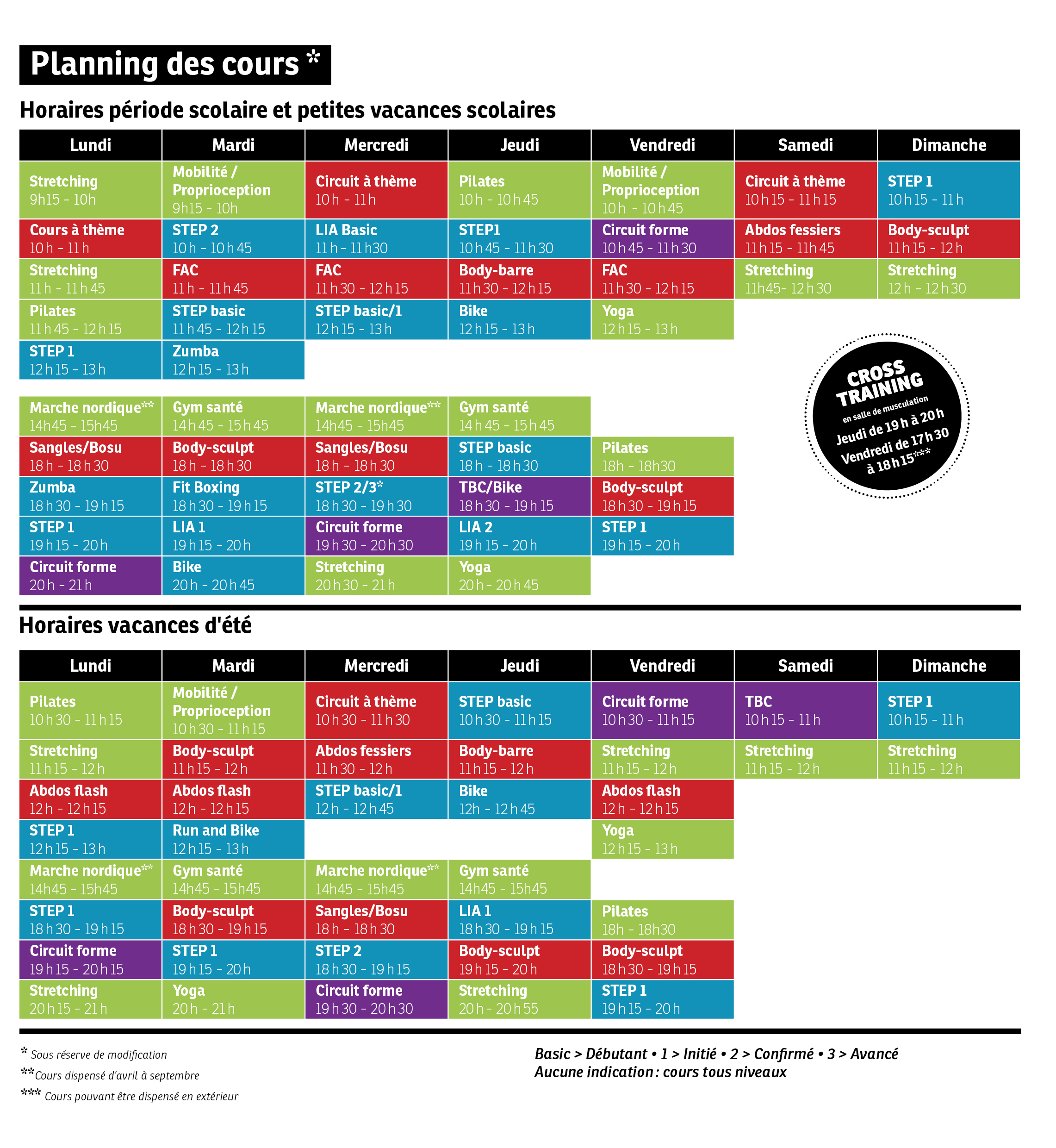 Cours à thème 10h-11h | STEP 2 10h-10h45 | LIA Basic 11h-11h30 | STEP 1 10h45-11h30 | Circuit forme 10h45-11h30 | Abdos fessiers 11h15-11h45 | Body-sculpt 11h15-12h |